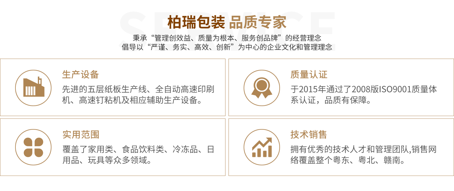 公司生产的瓦楞包装纸箱质量稳定,为国内外众多知名企业选用、配套,覆盖了家用、食品、饮料、冷冻、日用品、玩具等众多领域,获得众多优秀供应商、优秀配套企业称号。